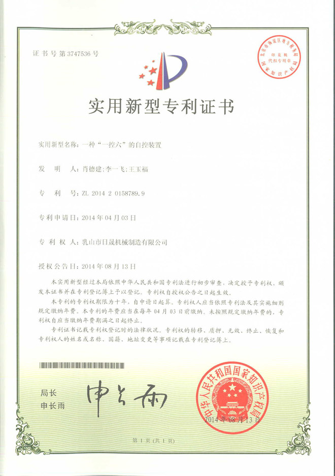 Patent certificate----"A charged six" mine equipment automatic control device